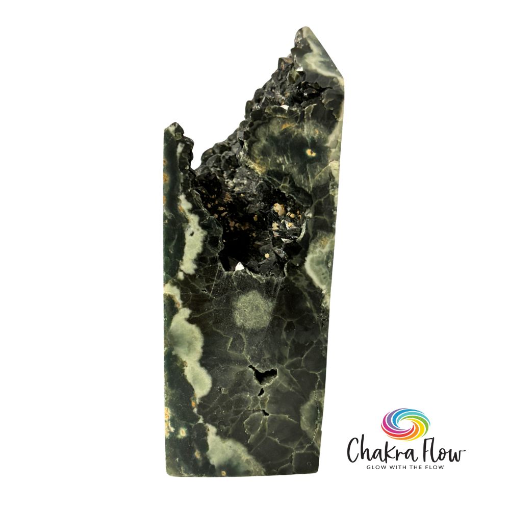 Ocean Jasper is prized for its kaleidoscopic array of colors and mesmerizing patterns, which vary widely from specimen to specimen. It typically features a combination of vibrant hues, including shades of green, yellow, orange, red, pink, and white, often arranged in swirling patterns, orbs, and concentric circles. These intricate designs are created by the presence of mineral impurities and the unique geological processes that formed the gemstone. When polished, Ocean Jasper displays a smooth, glossy surface that highlights its captivating patterns and colors. Due to its striking appearance and rarity, Ocean Jasper is highly sought after by collectors, lapidaries, and jewelry designers alike. Beyond its aesthetic appeal, Ocean Jasper is believed to possess metaphysical properties that promote emotional healing, relaxation, and a sense of tranquility, making it a popular choice for holistic practices and spiritual rituals.