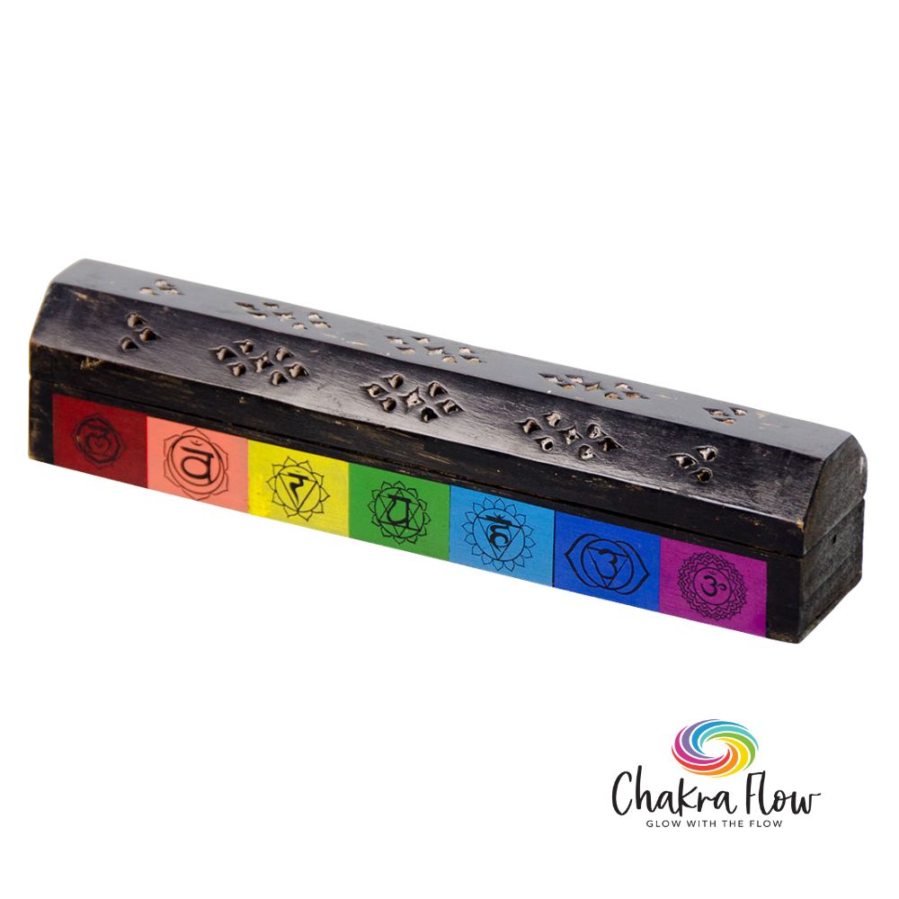 The colors and symbols of the seven chakra has been imprinted onto the front of this black painted wood incense storage box. It has a decorative cutout styled hinged lid, 2 brass inset plates for coning burning and a hidden side compartment for storing incense stick.