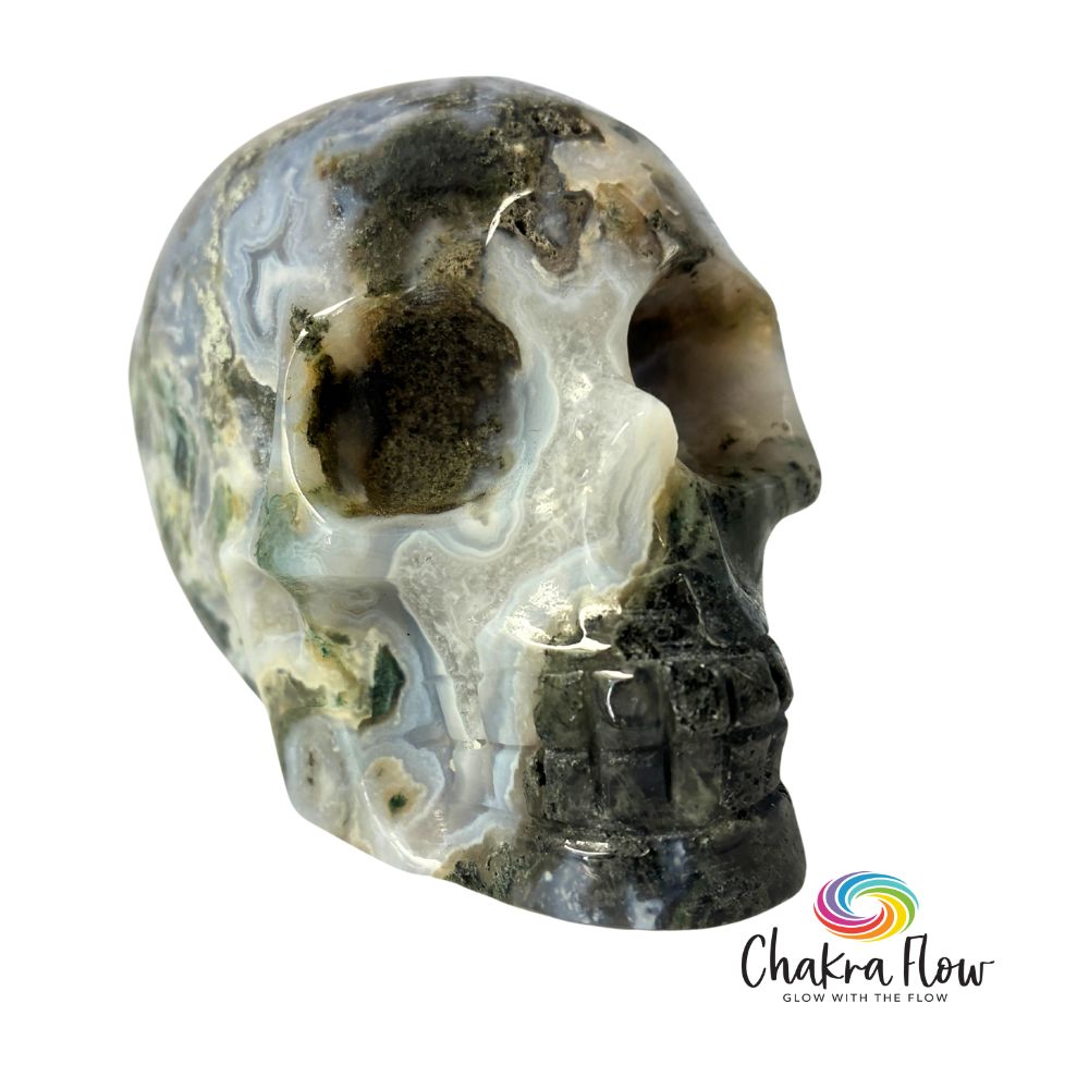 A 3.5 inches Moss Agate Skull. Crafted with precision, it showcases the distinctive shape of a skull, making it a captivating focal point for any space.