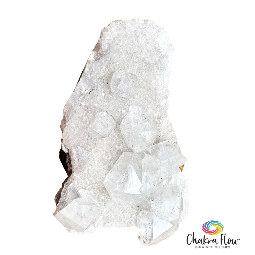 Presenting an exquisite Apophyllite Chalcedony Specimen from Jalgaon, India, standing at an impressive 4 inches with a base measuring 2.5 inches in width and 2 inches in thickness. Weighing 306 grams, this unique specimen captivates with its striking crystal formations and delicate translucency.